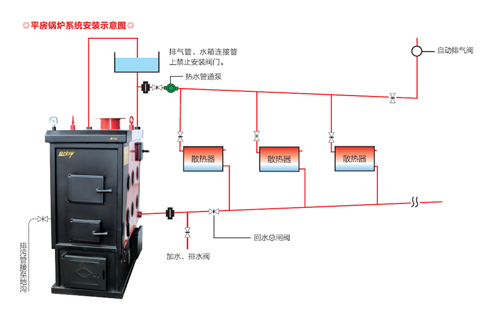 如管路太長,可加水泵強(qiáng)制循環(huán)。用戶自配水泵裝在出水部位,否則會造成鍋爐臌脹。